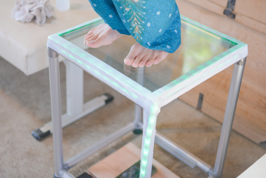 ピドスコープとは、アクリル板の上に立ち、足の裏を写して足の接地状態を視覚的に確認できる装置です。